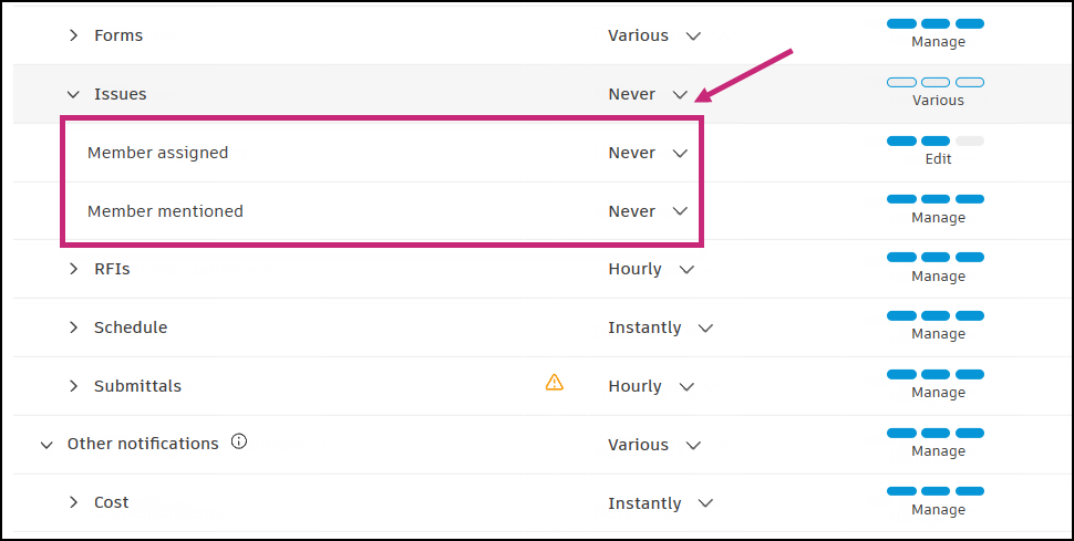 For example, project administrators can set notification frequency for the Issues tool to Hourly for each status and due date change and to Instantly for each event of assigning an RFI to a member. Also, project administrators can turn off notifications for all or some tools and notification types.