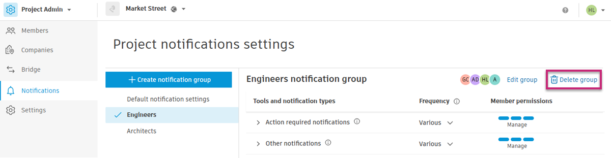 A project administrator can create notification groups of individual members, companies or roles, and control notification settings and permission levels for each notification group.