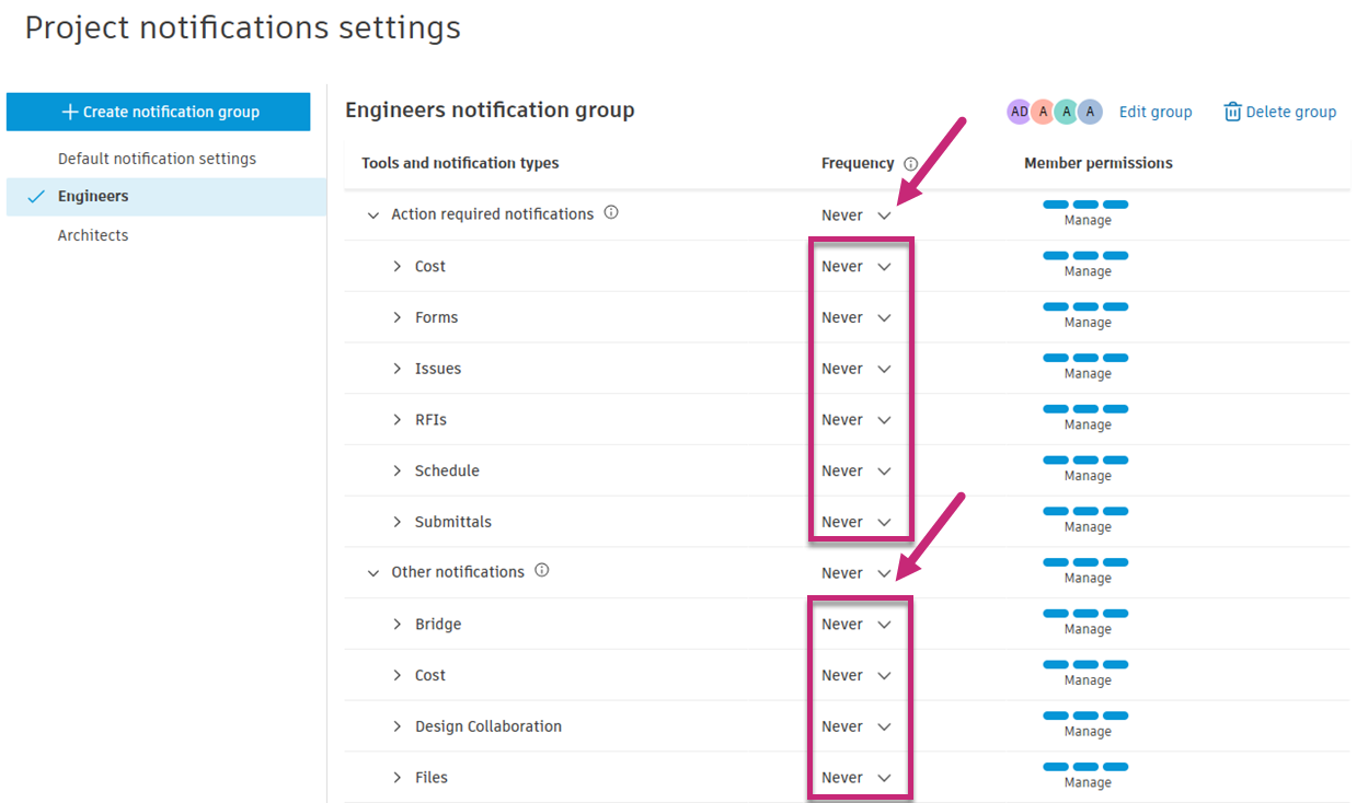 Project administrators can use default notification settings, or create notification groups of individual members, roles or companies. They can then manage the frequency of email notifications and control permission levels for selected tools and notification types in each such group.