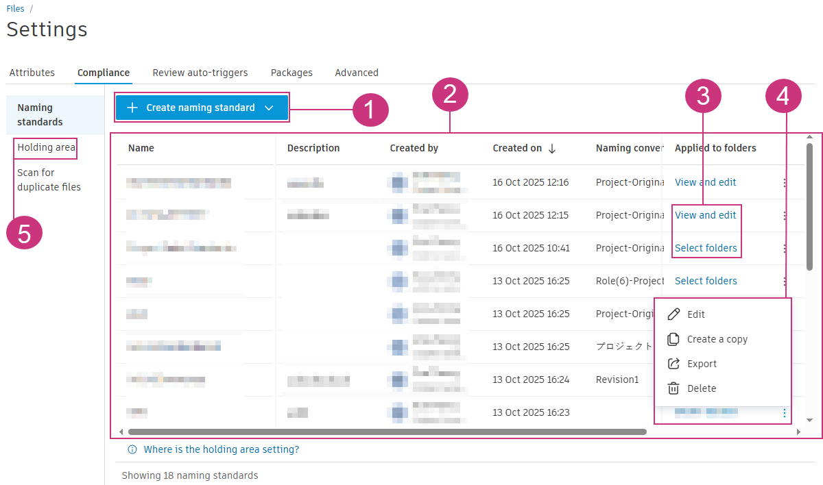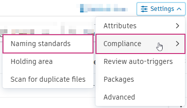 Project administrators can access, create and manage naming standards from Settings in the Files tool.