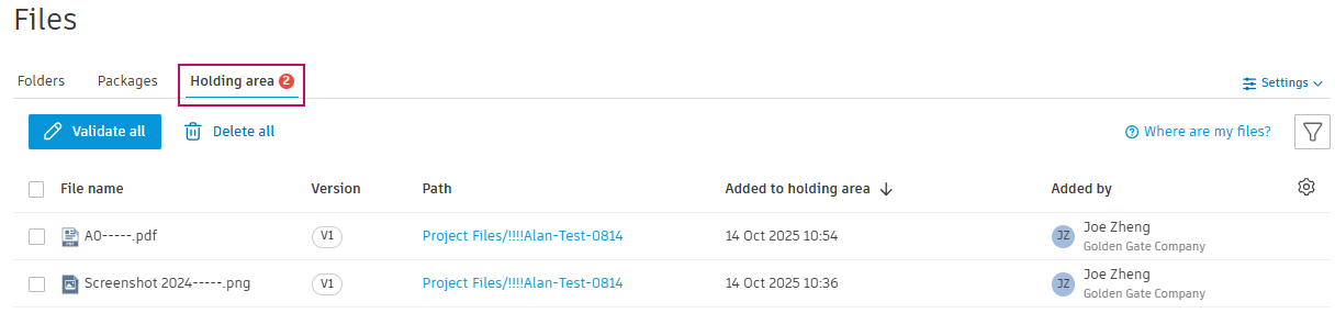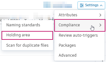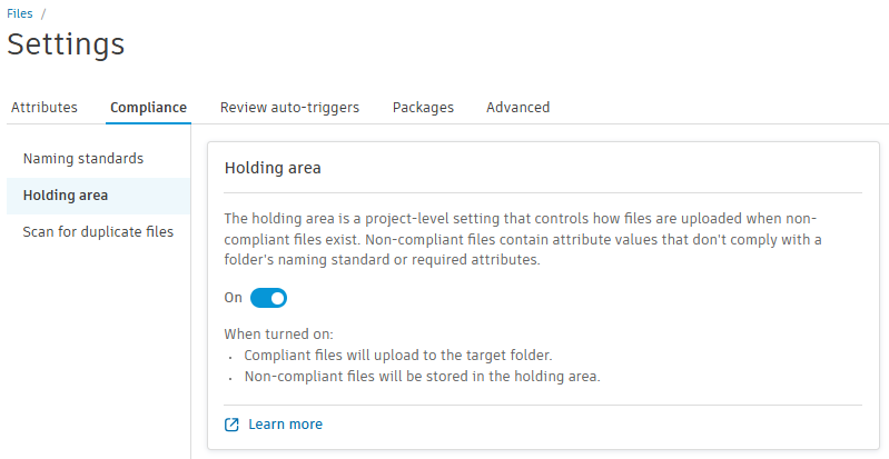 The holding area setting is a project-level setting that controls how files are uploaded when non-compliant files exist in the selection. Non-compliant files are files that contain attribute values that don't comply with a folder's naming standard or required attributes.