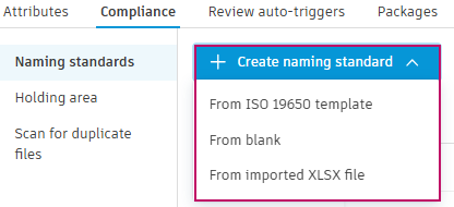 Create naming standards and apply them to different folders in the Files tool to control the names of their files. You can create naming standards from the following options: