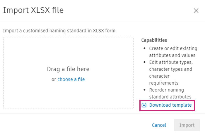 You can download an XLSX template of the ISO 19650 naming standard and edit, add and remove attributes and settings. Once completed, you can import your configured naming standard to a project, or multiple projects.