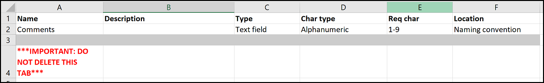 In the example below, a new text field tab has been created, and the attribute named Comments is in cell A2. The Char type is alphanumeric in cell D2, with a required character length value from 1–9 characters (inclusive) in cell E2. This attribute will be displayed in the naming convention as selected in cell F2.