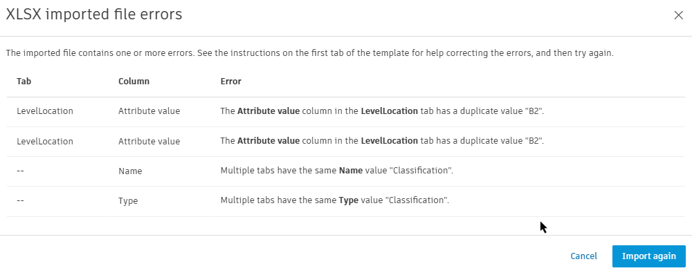 When you attempt to import naming standard, we’ll check if the template adheres to the required format. If not, a table specifies each error and provides guidance on how to resolve them before attempting the import again.