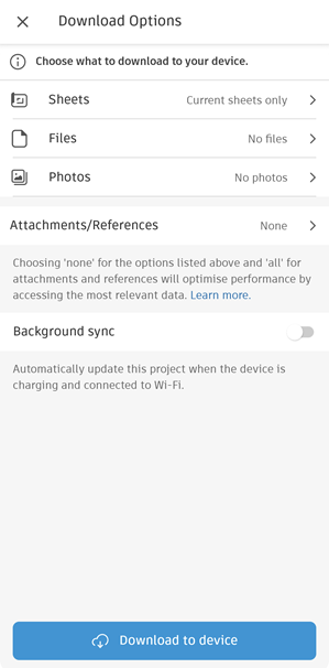 You can sync and download a project to your iOS or Android mobile device and work with any downloaded files, even if you are offline. You can choose file download options when you initially download a project, and refine download options later for individual folders and files with the choice of automatically downloading the latest versions.