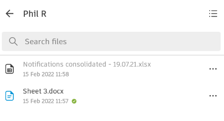 A green tick icon will display next to a downloaded file and next to any folder where all the contained files are downloaded. In the image below, Sheet3.docx is downloaded and is ready to view. The other file is dimmed as it is not downloaded and therefore can't be viewed.