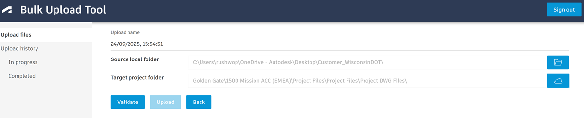 Select the relevant account, project and project folder. You can't upload to a folder with a naming standard applied.