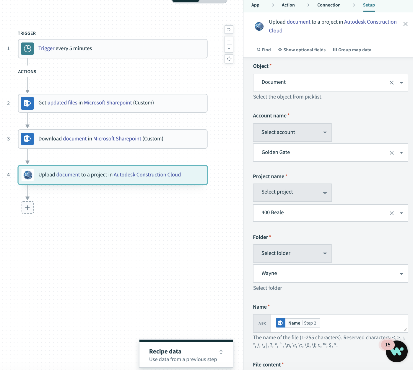 The following recipe below shows how you can utilize the "Upload Documents to a Project" action in Autodesk Construction Cloud to upload project files to specified folders in ACC projects, carrying over the metadata from the file in your cloud storage solutions.