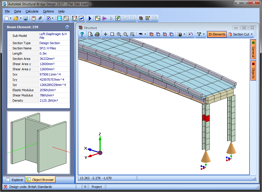 A refined analysis model can be viewed with 3D object rendering. This allows the user to check the structural integrity of the model. The 3D objects rendered include beam elements, finite elements, supports, beam releases and post tensioned tendons. Features include:
