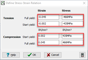 The reinforcement is modelled as ‘reinforcing steel – inclined’ and specified as a general stress-strain material of type ‘elastic-plastic with offset’. The stress and strain limits should be set with the start yield strain set as ±0.002 (stress = ±435N/mm²) and full yield strain set as ±0.045 (stress = ±466N/mm²).