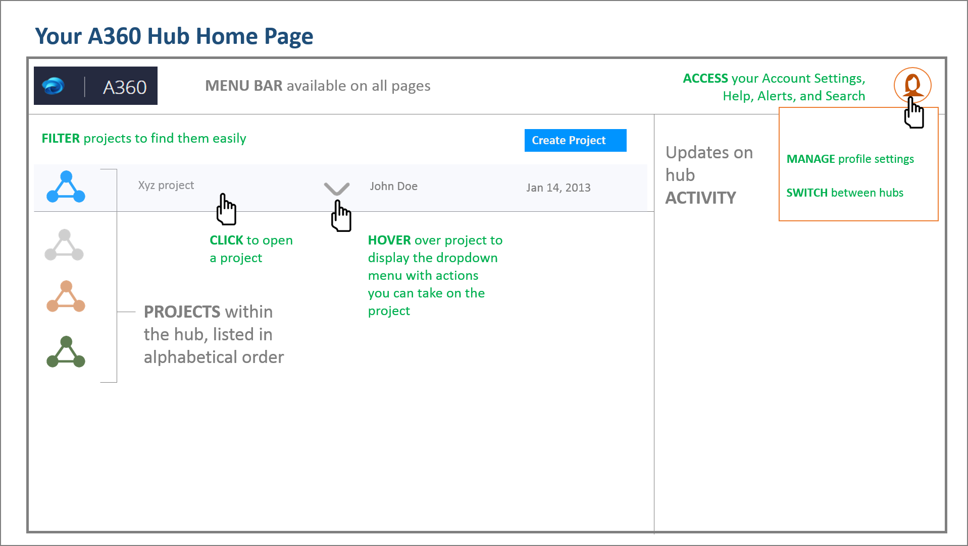 When you sign in to A360, the hub home page or the Projects Page opens. Below is a layout of the Projects page to help you find your way on the page.