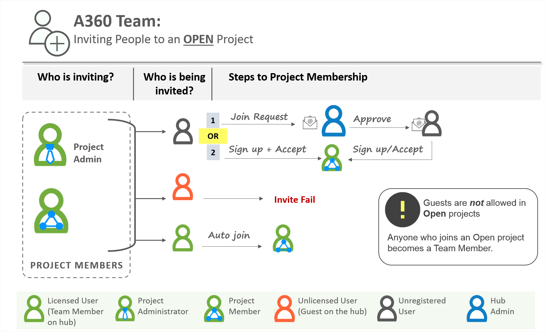 Open projects do not allow guests on the hub as project members. Invites to existing guests will fail. Invites to unregistered users may be subject to Hub admin approval. See illustration below to understand how invites to Open projects work.