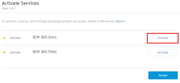 - On the Activate Services page, you can add multiple project administrators to a project. Next to a BIM 360 service heading, click Activate to activate that service.