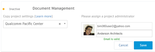 - (Optional) When activating Document Management, you can copy a folder structure from an existing project. Under Copy Project Settings, search for a project name and make your selection.