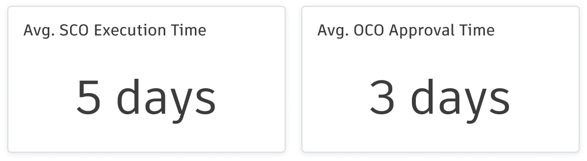 This card displays the average time taken for the approval of OCOs and the execution of SCOs within a project. It provides insights into the efficiency of the change order processes by showing how long, on average, it takes to complete these tasks.