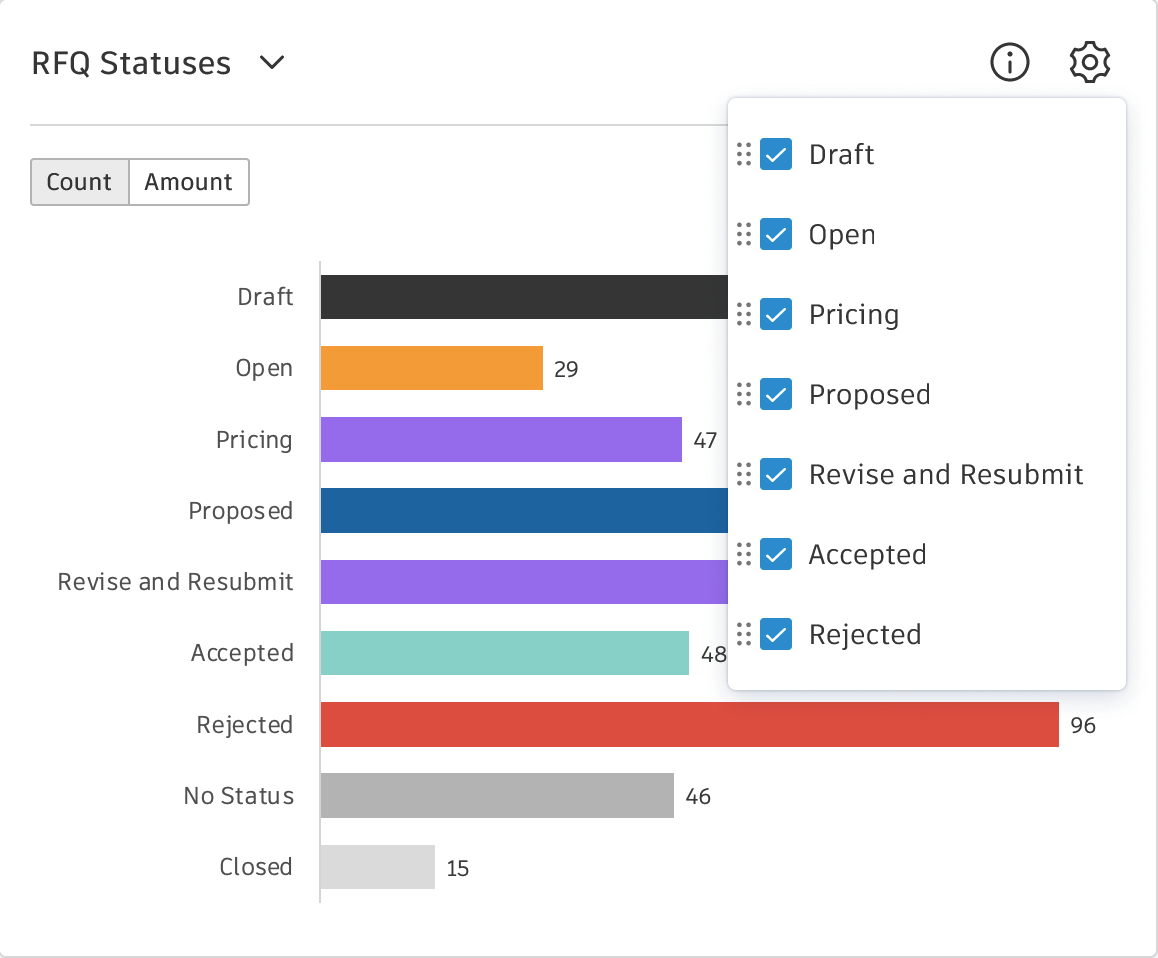 Toggle items in the chart legend (Original Budget, Revised Budget, Original Commitment, Forecast Final Cost) of a bar chart or pie chart to choose what to display in the card.