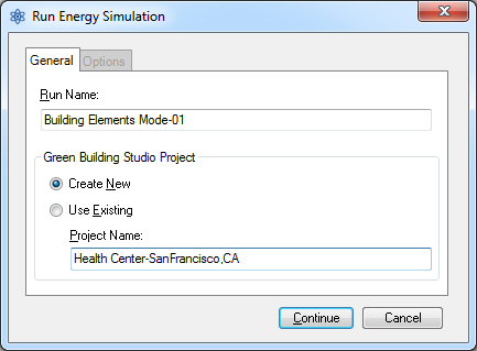 In the Run Energy Simulation dialog specify the run name and the Green Building Studio Project to assign the run to. (Choose a name that is descriptive of the model and energy settings, and ensure that the Project you’re assigning the run to have the proper location and building type settings.) Then click Continue. |