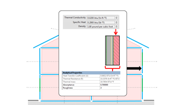 The behavior of the heat transfer across these surfaces is dictated by the materials (concrete, glass, insulation, etc). These affect the heating and cooling energy required to maintain comfort. Thermal properties considered include density, specific heat capacity, and conductivity. The properties of each surface account for the combined thermal properties of the layered building constructions. |