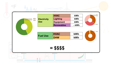 Finally, based on all that we’ve modeled and simulated, we can extract energy use and cost predictions. These energy use values are broken down by energy source (electricity, fuel) and also by end use (lighting, HVAC, etc). This can be translated to cost by multiplying predicted use with the predicted utility rates of each energy source. |