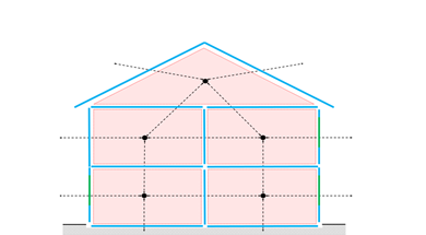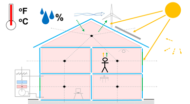 These spaces exchange heat with the outside environment and with each other (the dotted lines). This heat transfer happens across surfaces of the model, abstracted from the geometry and representing the walls, roof, floors, and windows of the building (blue and green lines). |