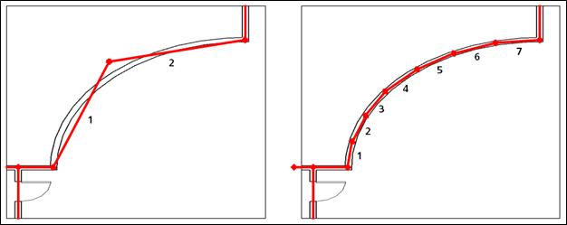 The illustration below shows how a simple curved wall could be represented in an EAM with either two or seven faceted Boundary Surfaces. The key question here is what level of discretization is enough; the former may well capture overall area effectively, but will round solar shading effects.