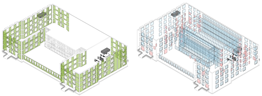 Surfaces shown within an EAM created from a detailed BIM model. Exterior walls are shown on the left. Windows and doors are shown on the right.