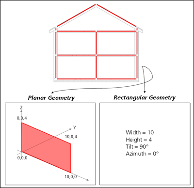 Surface Rectangular Geometry captures the same key information (area and position of the Surface relative to the sun and wind). However, it simply uses numerical values for height, width, tilt and orientation.