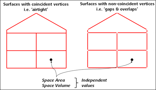 The reality is that Space Area, Space Volume and Boundary Surfaces are all independent items and this means that Boundary Surfaces can have small gaps between them (or even small overlaps). This is important because airtight boundaries can be difficult or very expensive to determine accurately. In reality, a perfectly “airtight” model will have negligible impact on the reliability of the EAM.