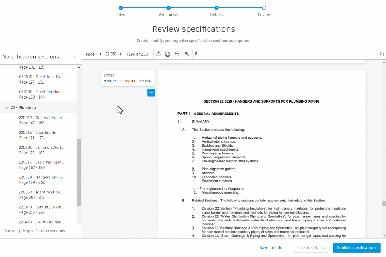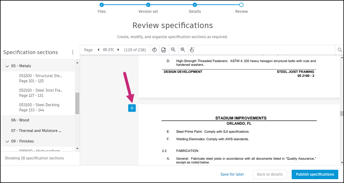 As you scroll through the specification, you can use the blue Plus button displayed at the beginning of each page to add sections.