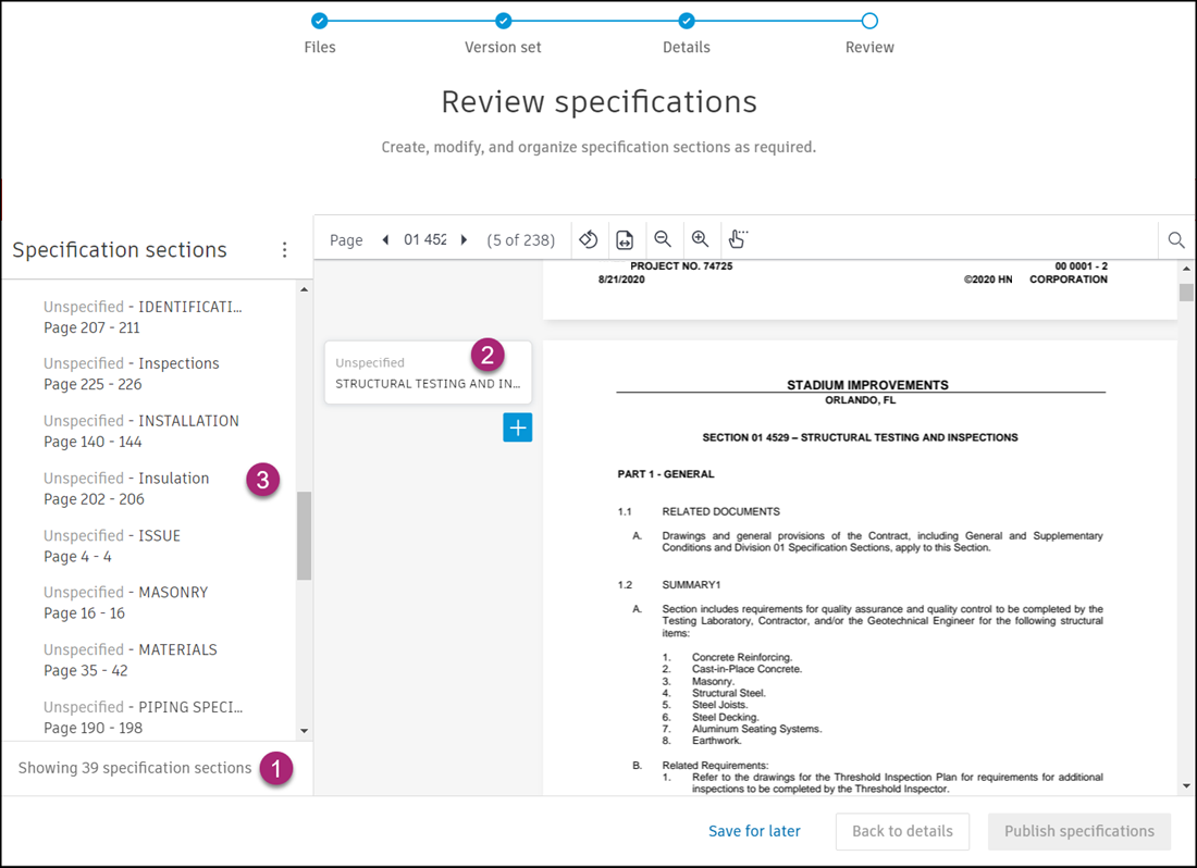 2: Section markers indicate start pages of automatically generated sections, and deliver information about section codes and descriptions. See Edit Specification Sections for details.