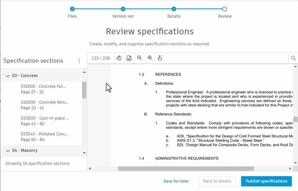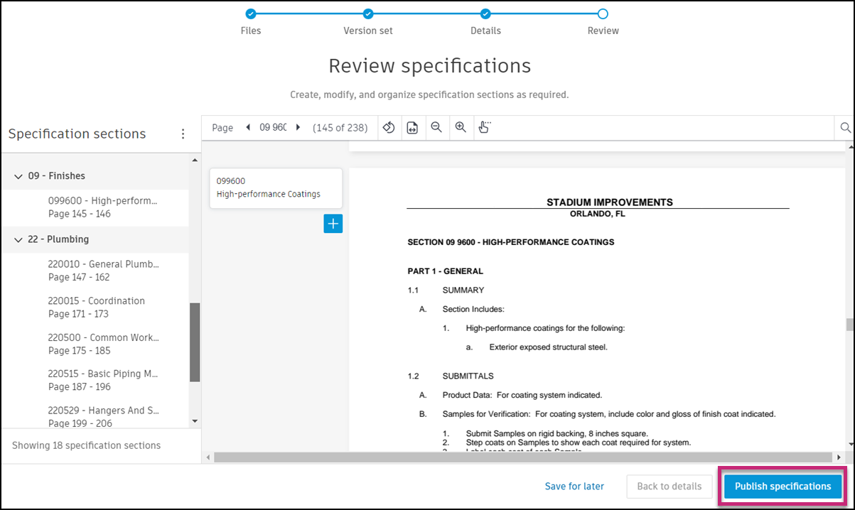 The final step in the publishing process allows you to review your specifications to ensure that all sections have been recognized correctly and are located in desired locations.