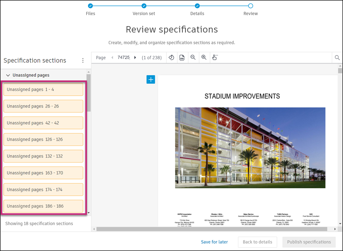 Learn how to handle unassigned specification pages and add specification sections.