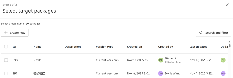 If it's a fixed version package, select the relevant version for each added file. Current version packages will on display files as their latest current versions.