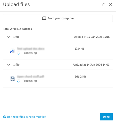 The files are added to the Upload files dialog. You can also select files or add more files From your computer. If you add more files, these will be added in batches.