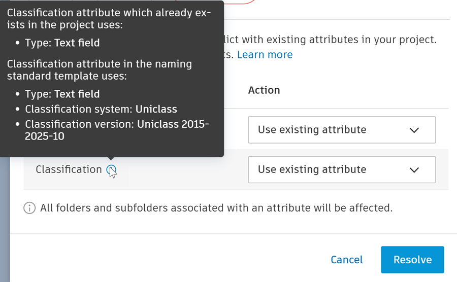 The conflicted attributes are listed below. You can hover the info icon to view the attribute details of the conflicting attribute in the naming standard compared with the same attribute which exists in the project.