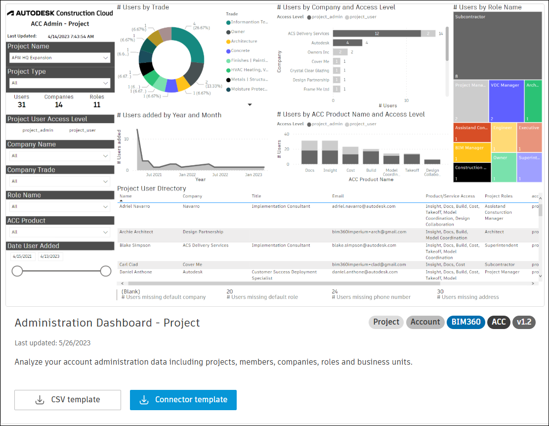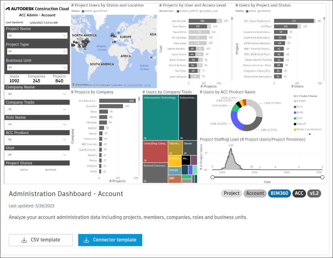 The Administration Dashboard - Account and Administration Dashboard - Project PowerBI templates described in this topic enable you to visualize and analyze administration data from Autodesk Construction Cloud.