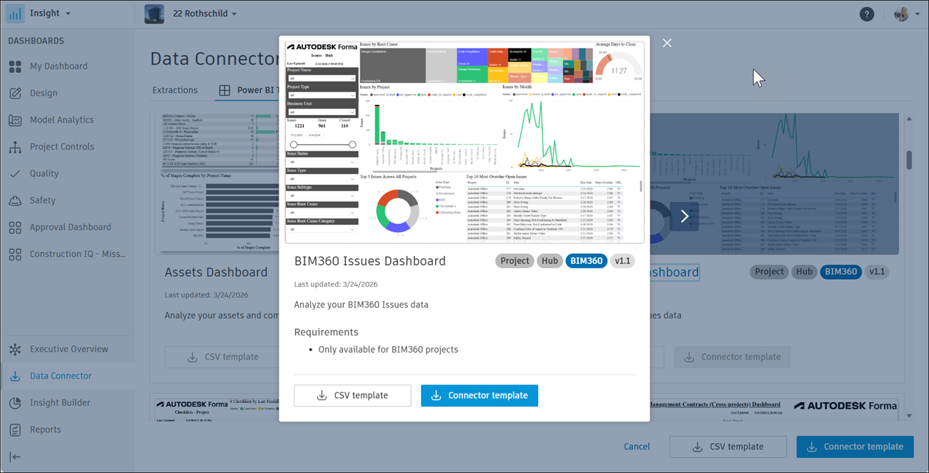 The BIM 360 Issues Dashboard described in this topic allows you to analyze your BIM 360 Issues data.