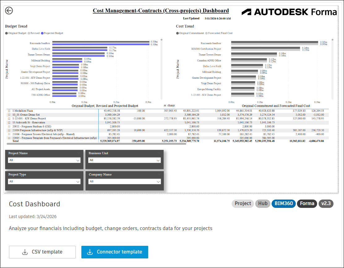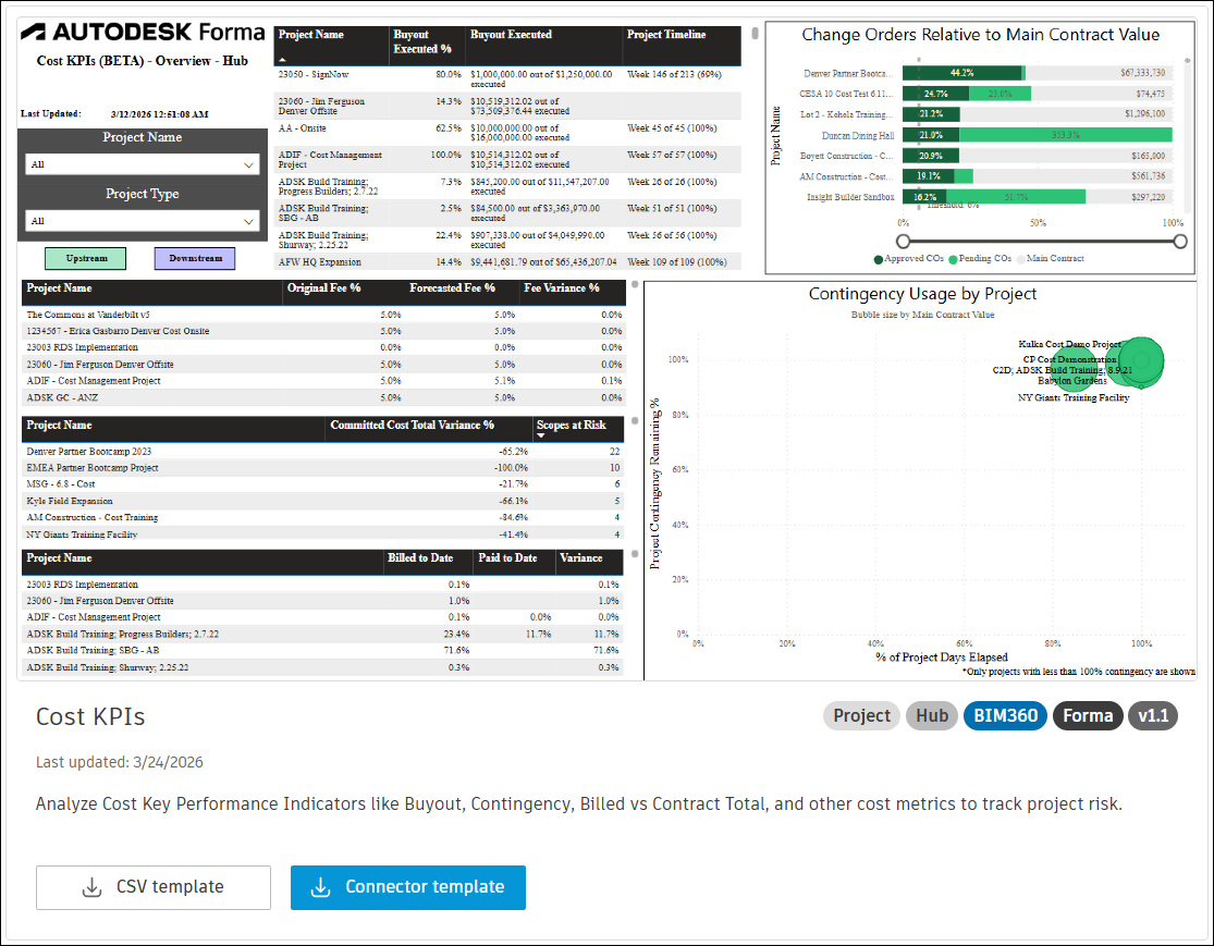 The Cost Dashboard and Cost KPIs - Project templates described in this topic allow you to visualize and analyze financial and cost key performance indicator (KPI) data from Autodesk Forma.