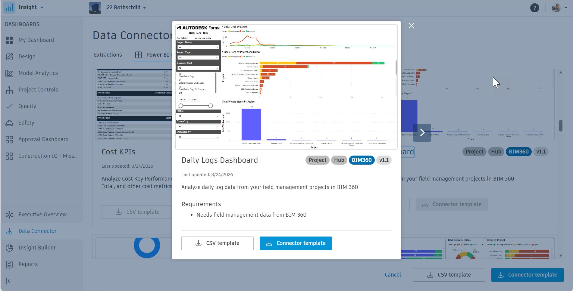 The Daily Logs Dashboard described in this topic allows you to visualize and analyze daily log data from your field management projects in Autodesk Forma and BIM 360.