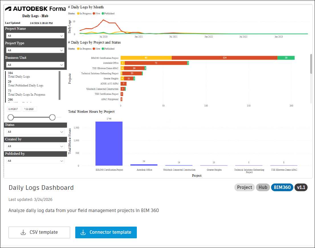 The Daily Logs Dashboard template described in this topic allows you to visualize and analyze daily log data from your field management projects in Autodesk Forma BIM 360.
