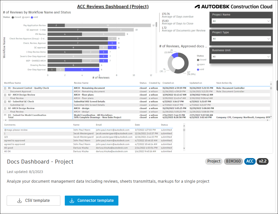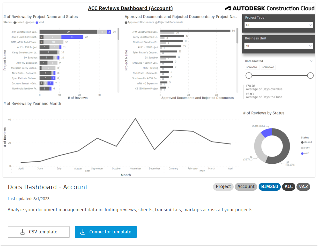 The Docs Dashboard - Account and Docs Dashboard - Project Power BI templates described in this topic enable you to visualize and analyze document management data from Autodesk Construction Cloud.