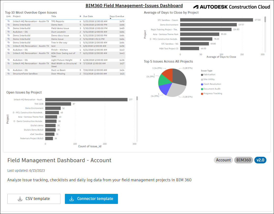 Use this template to analyze issue tracking, checklists and daily log data from your field management projects in BIM 360.