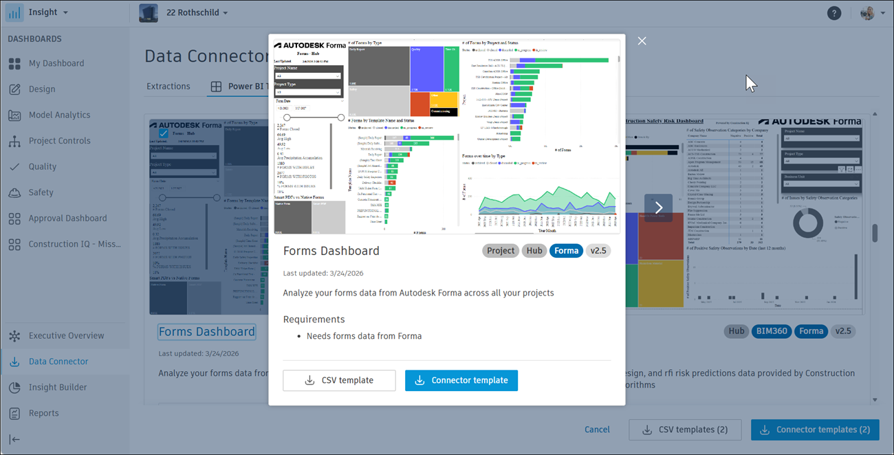 The Forms Dashboard described in this topic allows you to visualize and analyze your form data for Autodesk Forma.