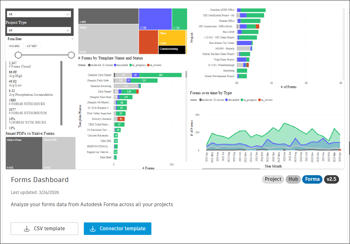 The Forms Dashboard template described in this topic allows you to visualize and analyze form data from Autodesk Forma.