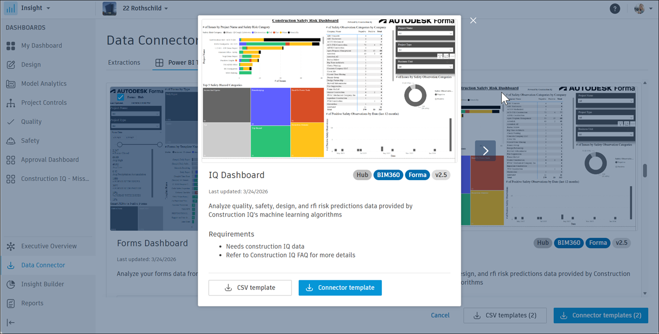 The IQ Dashboard described in this topic allows you to visualize and analyze your Construction IQ data forAutodesk Forma and BIM 360.