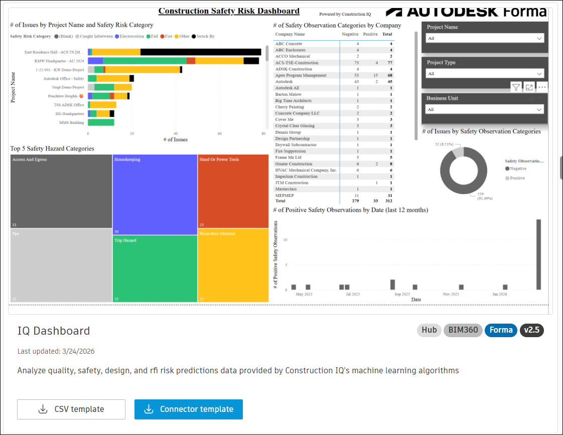 The IQ Dashboard template described in this topic allows you to visualize and analyze Construction IQ data from Autodesk Forma.