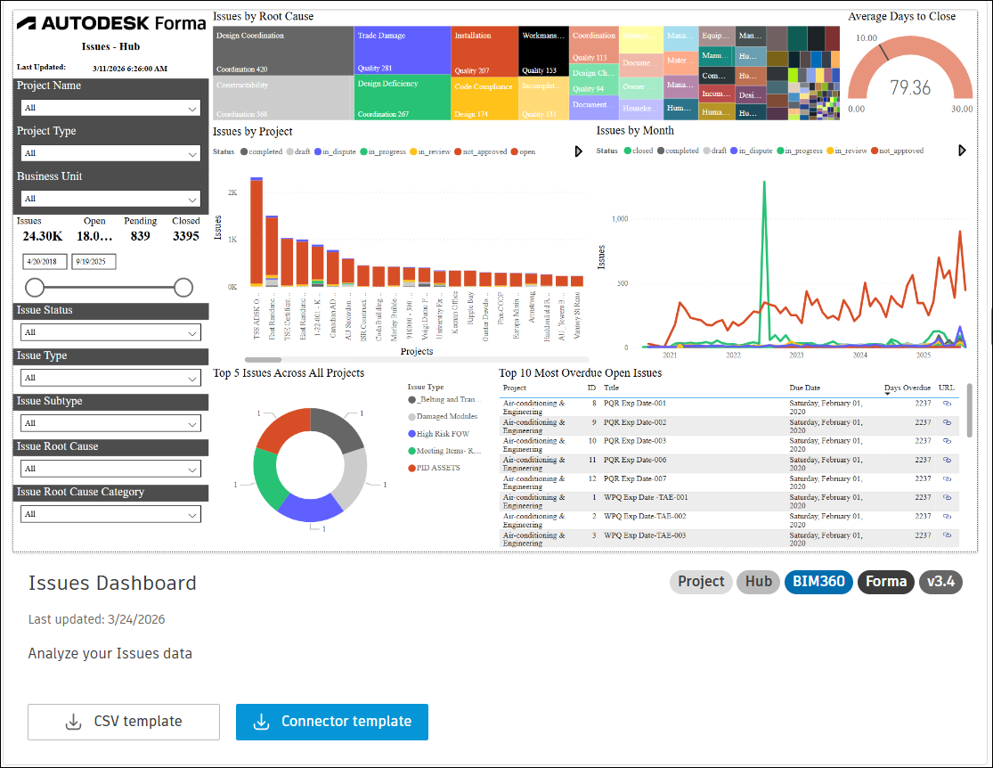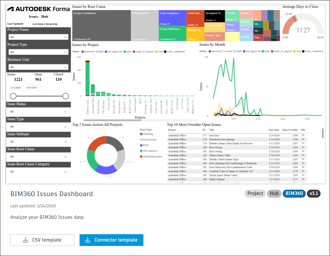 The Issues Dashboard and BIM360 Issues dashboard templates described in this topic allows you to visualize and analyze issue data from Autodesk Forma and BIM360.