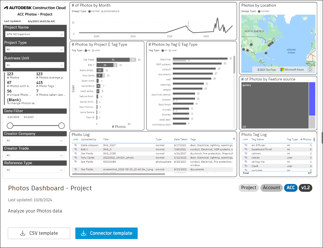 The Photos Dashboard - Account and Photos Dashboard - Project Power BI templates described in this topic enable you to visualize and analyze photo data from Autodesk Construction Cloud.