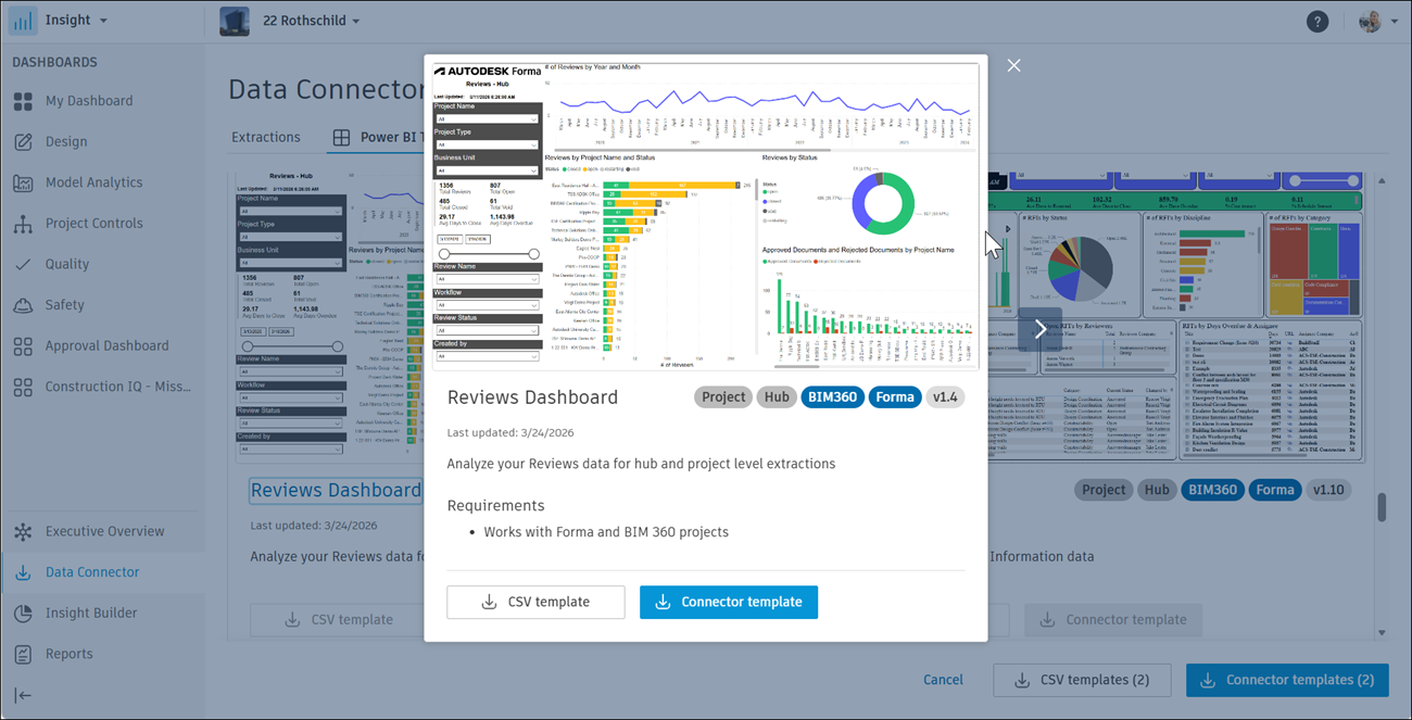 The Reviews Dashboard described in this topic allows you to analyze your Reviews data for hub and project level extractions for Autodesk Forma and BIM 360.